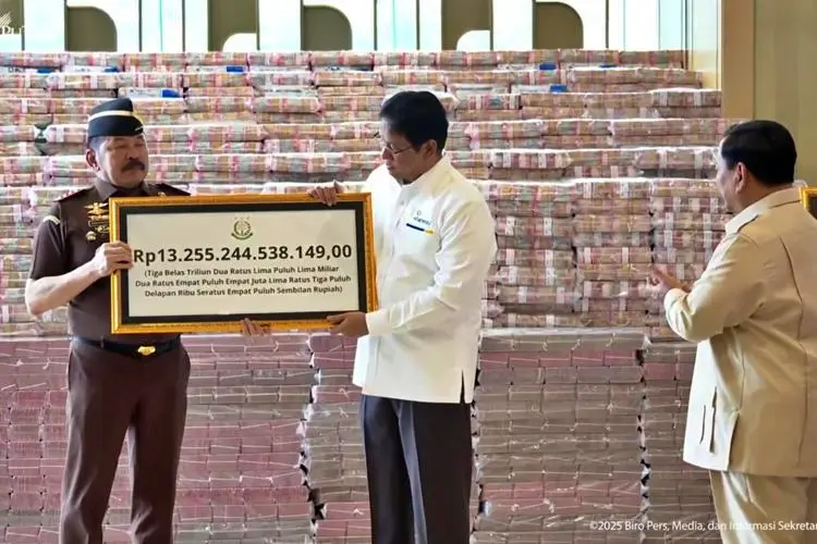 BERANDAPOSTCOM, JAKARTA – Presiden Prabowo Subianto menyaksikan penyerahan uang Rp13 triliun hasil sitaan kasus korupsi ekspor Crude Palm Oil (CPO) ke negara. Kegiatan tersebut berlangsung dalam Gedung Kejaksaan Agung (Kejagung), Jakarta, Senin (20/10/2025).