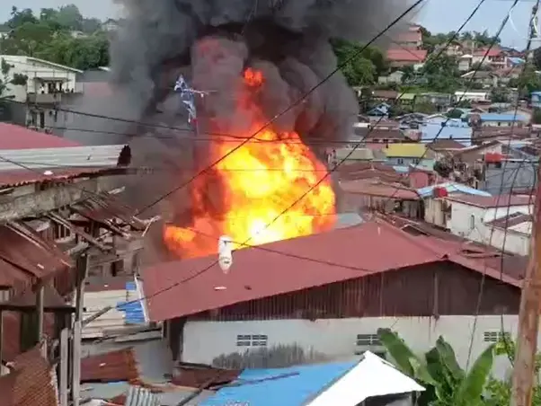 Peristiwa kebakaran terjadi belakang Masjid Al-Fallah. Warga setempat terlihat panik dan berupaya menyelamatkan diri serta barang-barang berharga dari rumah mereka.