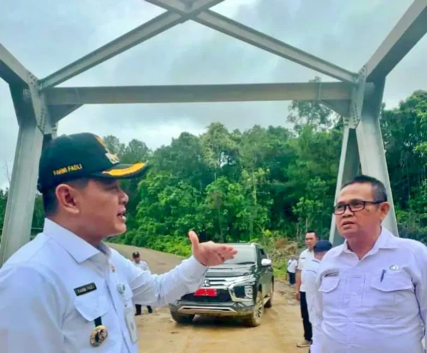BERANDAPOST.COM, TANA PASER – Bupati Paser Fahmi Fadli berbincang santai dengan Kepala Dinas Pemberdayaan Masyarakat Desa (PMD) Chandra Irwanadhi saat meninjau Jembatan Sei Tiwau pada Februari lalu.
