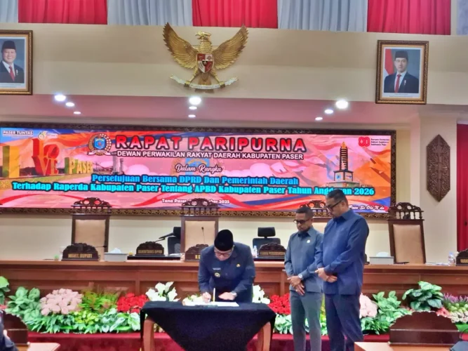 BERANDAPOST.COM, TANA PASER – DPRD dan Pemkab Paser menyetujui Raperda APBD 2026 serta Propemperda 2026 melalui Rapat Paripurna dalam ruang Baling Seleloi.