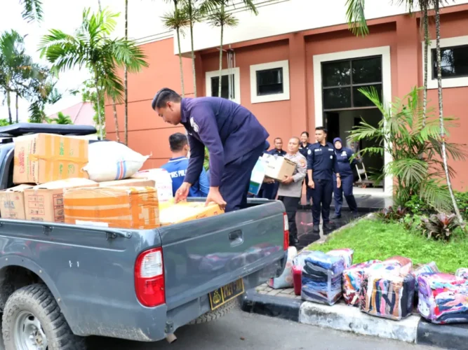 Polda Kaltim kembali menyalurkan bantuan pakaian layak pakai untuk korban bencana di Aceh, Sumut, dan Sumbar sebagai wujud kepedulian personel kepolisian. (Istimewa)