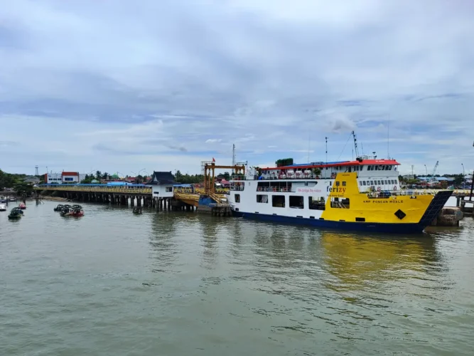Kapal feri yang sandar di Pelabuhan Penajam. Wakil Bupati PPU Abdul Waris Muin menilai rencana revitalisasi Pelabuhan Penajam sebagai langkah strategis memperbaiki wajah daerah penyangga IKN. (Berandapost.com)