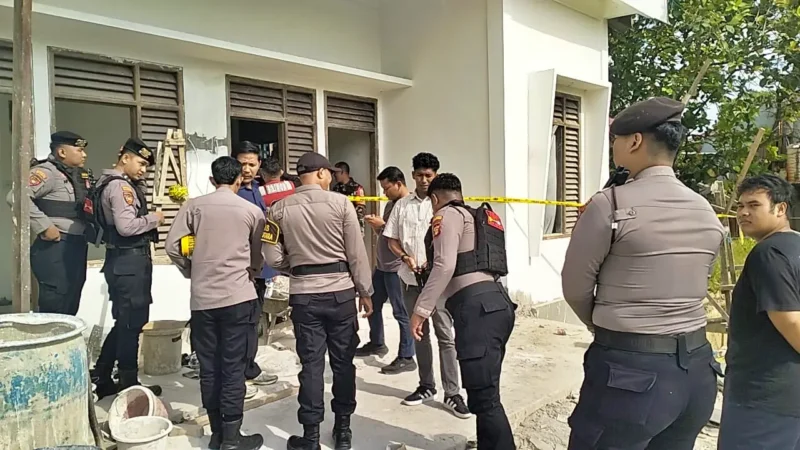 Petugas dari Polresta Balikpapan mengamankan lokasi penemuan jasad pria yang tergantung dalam proyek pembangunan rumah, Kelurahan Sumber Rejo, Kecamatan Balikpapan Tengah, Kota Balikpapan. (Info Bencana/Ruslan IB07)