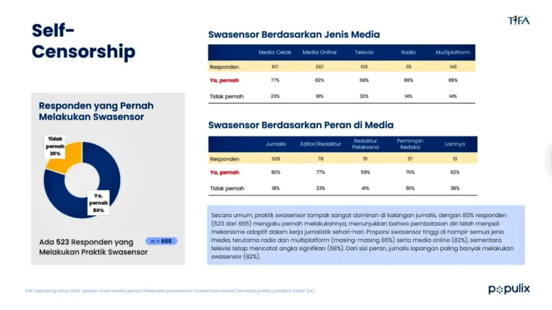 Yayasan Tifa, Konsorsium Jurnalisme Aman, dan Populix menyusun laporan IKJ 2025. Laporan tahunan yang terbit selama tiga tahun terakhir itu menunjukkan tren swasensor terus meningkat dan mulai memengaruhi pilihan objek liputan.