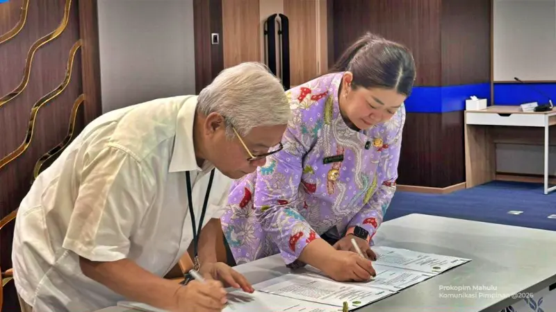 Dokumen kerja sama ditandatangani Bupati Mahulu Angela Idang Belawan dan Direktur SDM dan Transformasi Perum Bulog Prof. Dr. Sudarsono Hardjosoekarto.
